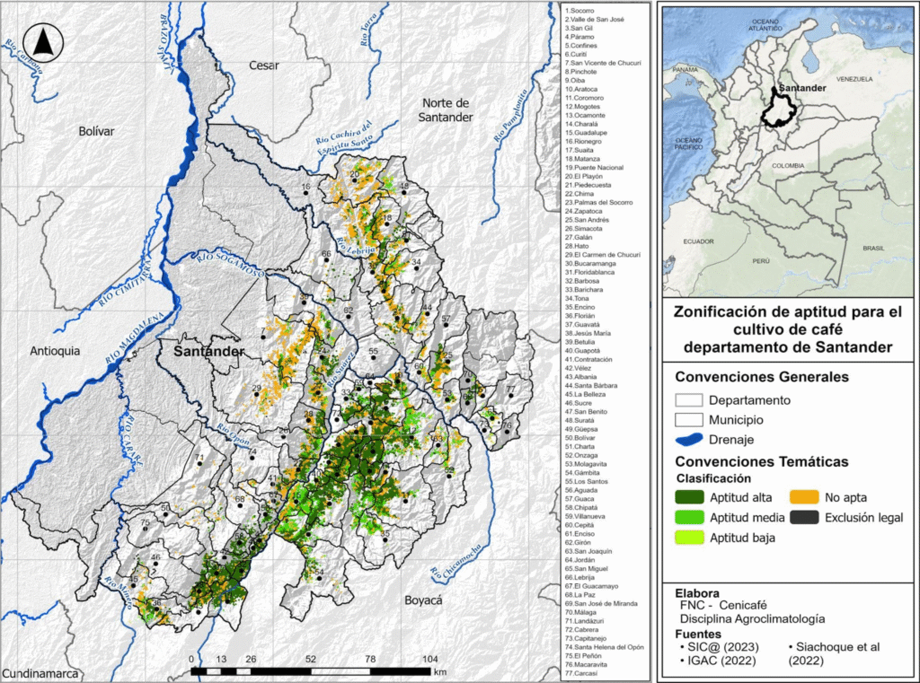 Adicionalmente, la Cámara de Comercio de Bucaramanga realizó capacitación a jóvenes cafeteros en mercadeo, comercialización, competitividad e innovación y por último el Centro Nacional de Investigaciones del Café – Cenicafé, aportó los datos históricos técnicos que permitieron construir las características agroclimáticas del departamento de Santander.